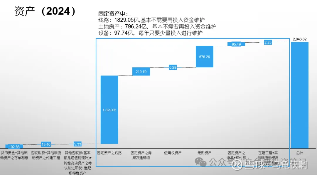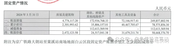 不同于东阿阿胶,京沪高铁是重资产公司。2024年年报显示,公司固定资产原值为2754亿(账面价值2144亿),其中房屋和建筑物307亿(账面价值219.7亿),线路和设备等共2447亿(账面价值1924.3亿);无形资产(土地使用权)原值为614亿(账面价值576亿)。固定资产在会计计算上虽然每年要不停的折旧,但京沪高铁的建设时间是2008-2011年左右,土地+房屋建筑到现在其实是大幅升值的。