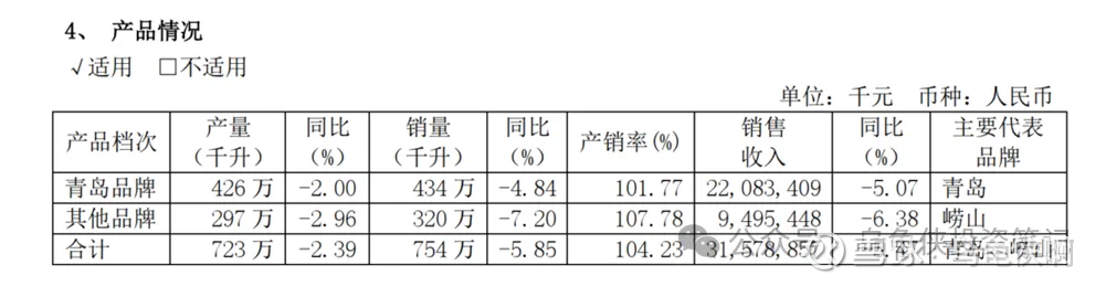 公司全年实现产品销量 753.8 万千升,青岛啤酒主品牌共实现产品销量 434 万千升,其中中高端以上产品实现销量 315.4 万千升。崂山啤酒和汉期啤酒共319.8万千升。公司继续实施青岛啤酒主品牌+崂山啤酒全国性第二品牌的品牌战略。