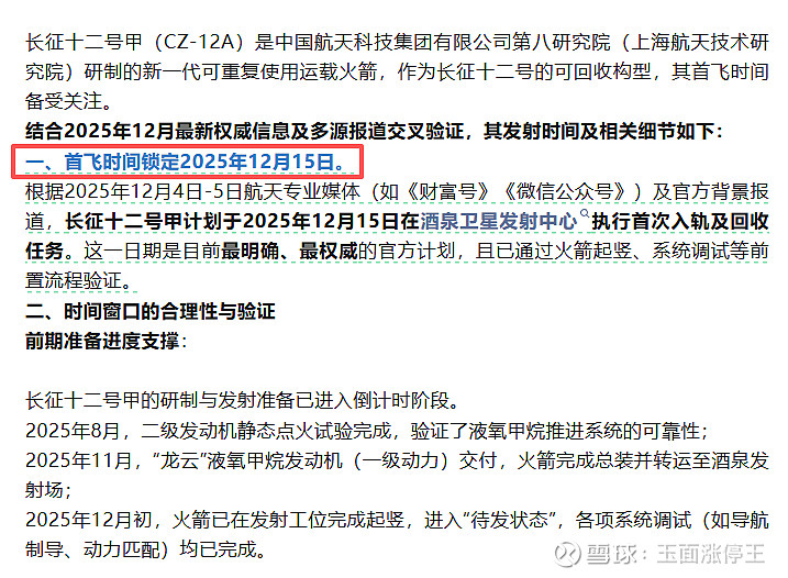 根据此前经验,火箭静态点火后,如无意外,将在一周左右后进行正式发射。这也符合此前的传闻,即长征十二甲将于12月15日(下周一)首飞。