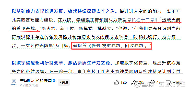 就在长征十二号甲发射的一个月前,中国航天科技集团发布公众号,其中提到要确保长征十二号甲首飞任务“发射成功、回收成功”。官方是不敢乱说话的,这个表态基本就可以表明,内部模拟回收成功率已经相当高了,甚至会远高于外界传闻的92%。长征十二号甲此次的“试验”其实就是奔着“国内首次”去的。