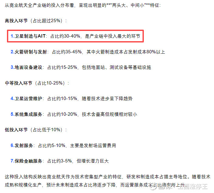 商业航天产业链是哑铃型,两头大,中间小,卫星制造+AIT成本占比约为30-40%,是产业链中投入最大的环节。从物料成本上看,卫星载荷(天线、转发器)、卫星平台(姿态控制等)各占50%。而AIT(卫星整星总装、集成和测试)占卫星总成本的15-25%左右(后续会随着批量生产模式下降)。也就是说,以一颗中型5000万元中型通讯卫星为例,AIT占1000万,卫星载荷、卫星平台各占2000万。