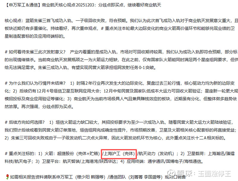 关于长征十二号甲,目前A股核心龙头是航天机电,但其并无商业航天相关业务,主要还是炒一个资产注入、借壳预期。而从产业链角度看,首推上海沪工。