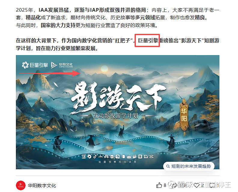 华阳文化是一家短剧全产业链生态平台公司,集合短剧投资、出品、发行于一体。与字节旗下巨量引擎深度合作,开展“影游天下”短剧游学活动,首站就是华阳文化上海总部。