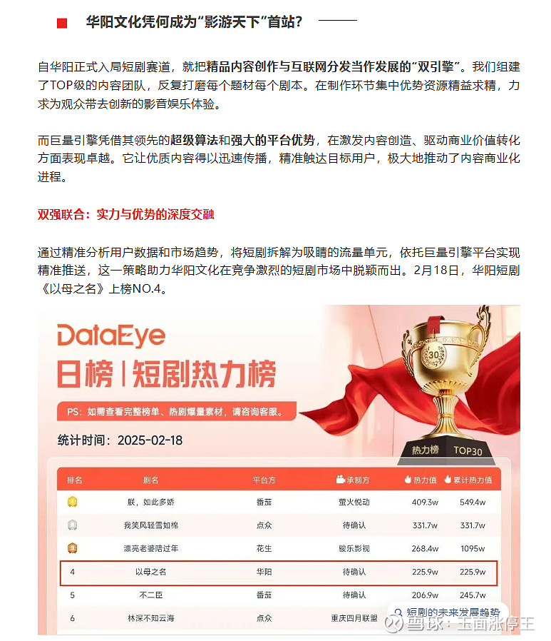 双强联合,助力华阳短剧《以母之名》登上短剧榜No.4,单剧日流水破峰100万