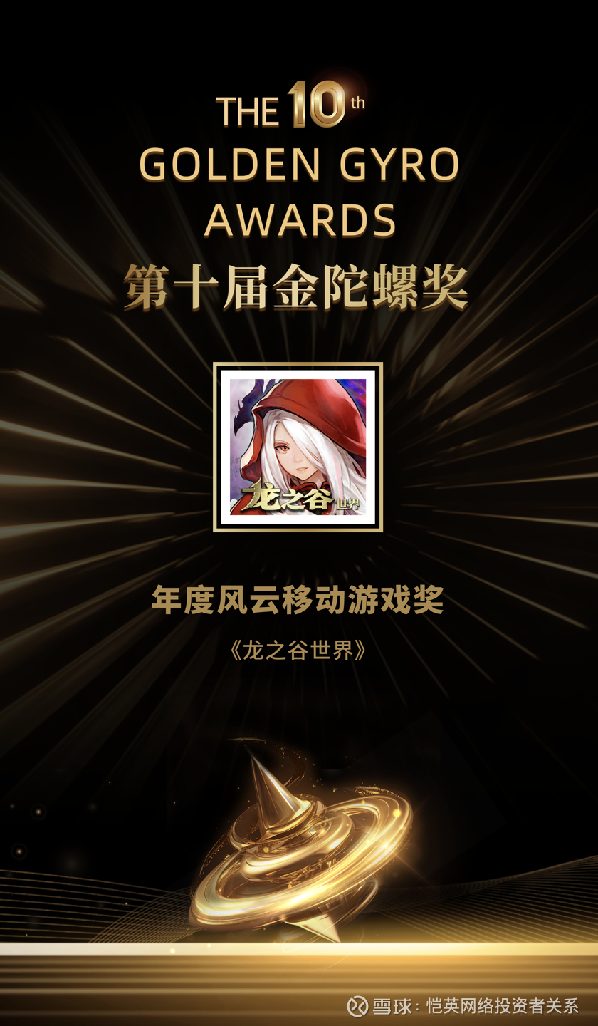 12月5日,第十届金陀螺奖颁奖典礼于深圳湾万丽酒店落下帷幕。恺英网络凭借强劲的企业综合实力与旗下产品的优质表现,荣获“年度影响力游戏企业奖”;联合发行产品《龙之谷世界》则摘得“年度风云移动游戏奖”。