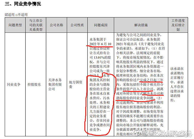 2022年6月10日天津水务集团控股渤海股份,同时大股东(天津水务集团)承诺在未来三年内(即截止2025年6月10日前)解决和上市公司渤海股份的同业竞争问题。