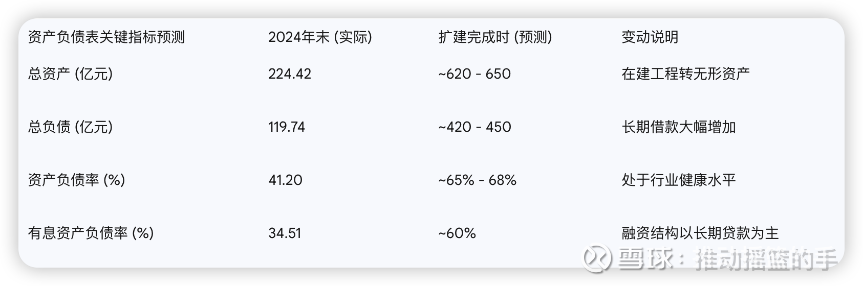 资产负债表关键指标预测2024年末 (实际)扩建完成时 (预测)变动说明