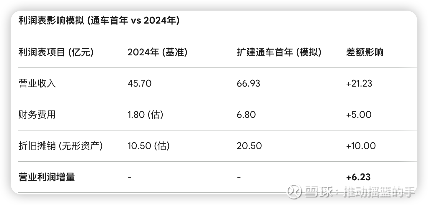 利润表项目 (亿元)2024年 (基准)扩建通车首年 (模拟)差额影响营业收入45.7066.93+21.23财务费用1.80 (估)6.80+5.00折旧摊销 (无形资产)10.50 (估)20.50+10.00营业利润增量--+6.23