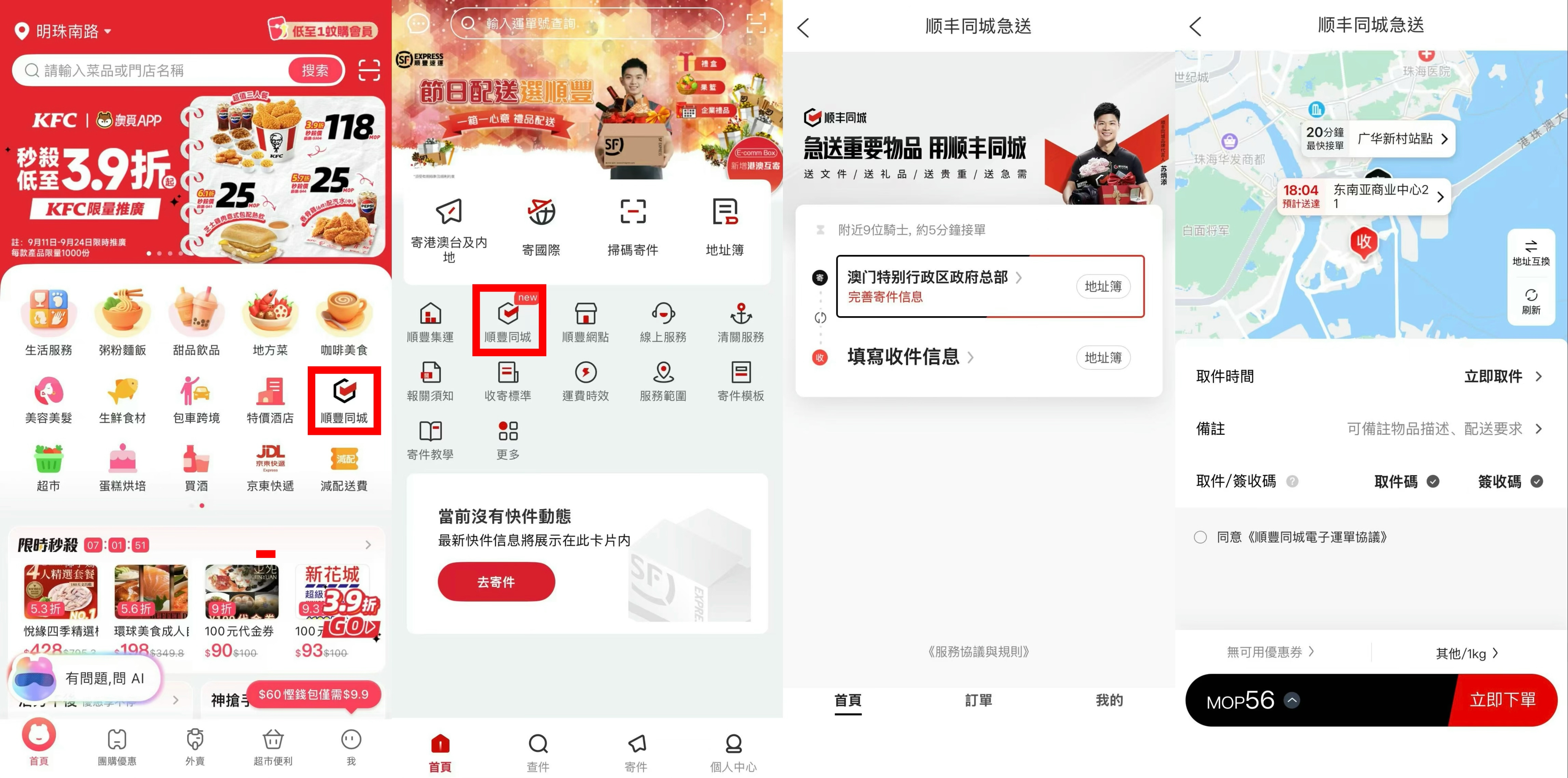 澳门商户可通过顺丰同城商家版下单;消费者用户通过“澳觅APP”或“顺丰速运(SF-EXPRESS APP)”选择“顺丰同城”服务,便可体验到顺丰同城提供的点到点全品类即时配送服务,初期配送范围覆盖澳门半岛。凭借更快速、稳定的配送体验,顺丰同城将进一步满足澳门居民对“即想即得”消费模式的需求。