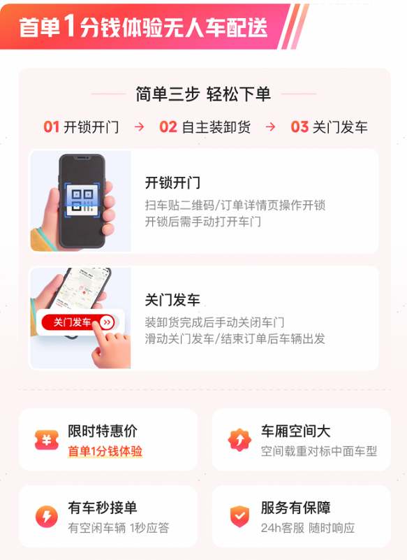 用户通过线上平台叫车,即可实现无人车即需即到、全程无人运输。投运车辆具备5.5立方米的载货空间和1吨的载重能力,为日常小批量重货运输提供了全新选择,有效提升货运效率与服务体验。当前用户可享受首单1分钱特惠。后续,这项服务还将在其他城市陆续开放。