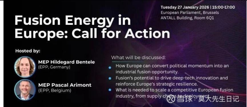 欧洲议会将于2026 年1月27日举行“欧洲聚变能源:呼吁行动”高级别听证会,会议旨在汇聚政策制定者,产业领袖与投资者,