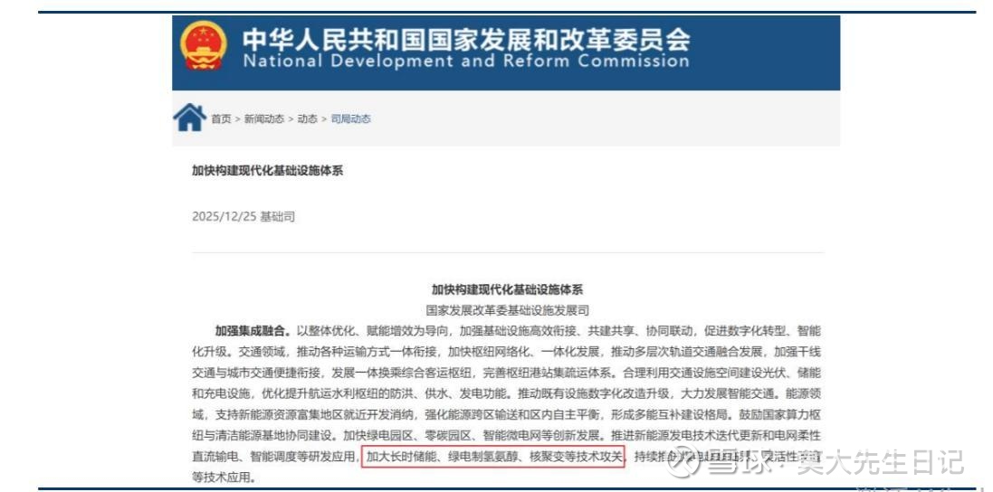 (1)2025 年12月25日,国家发改委基础设施发展司发布文章《加快构建现代化基础设施体系》,文章强调,要加大长时储能,绿电制氢氨醇,核聚变等技术 攻关,持续推进煤电超超临界,灵活性改造等技术应用。
