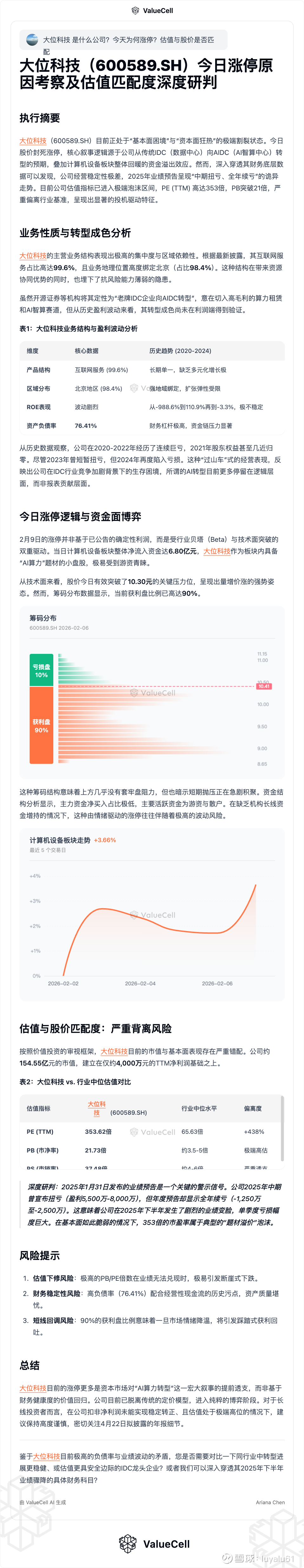 大位科技(600589.SH)$大位科技(SH600589)$ 目前正处于“基本面困境”与“资本面狂热”的极端割裂状态。今日股价封死涨停,核心叙事逻辑源于公司从传统IDC(数据中心)向AIDC(AI智算中心)转型的预期,叠加计算机设备板块整体回暖的资金溢出效应。然而,深入穿透其财务底层数据可以发现,公司经营稳定性极差,2025年业绩预告呈现“中期扭亏、全年续亏”的诡异走势。目前公司估值指标已进入极端泡沫区间,PE (TTM) 高达353倍,PB突破21倍,严重偏离行业基准,呈现出显著的投机驱动特征。