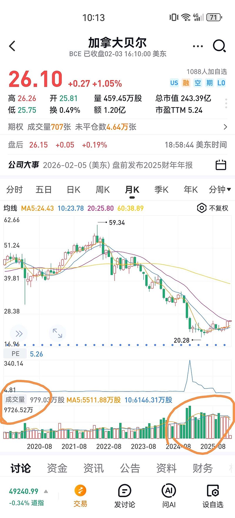 $加拿大贝尔(BCE)$ 昨天收盤已經站上上次底部反彈高點26.02,如果基本面配合,以下面月線底部成交的巨量堆積,將是近20年的底部,經歷近1年的建倉準備,除了分紅,成本价放在了23.6 ,希望這次押注成功,抄在無人問津處