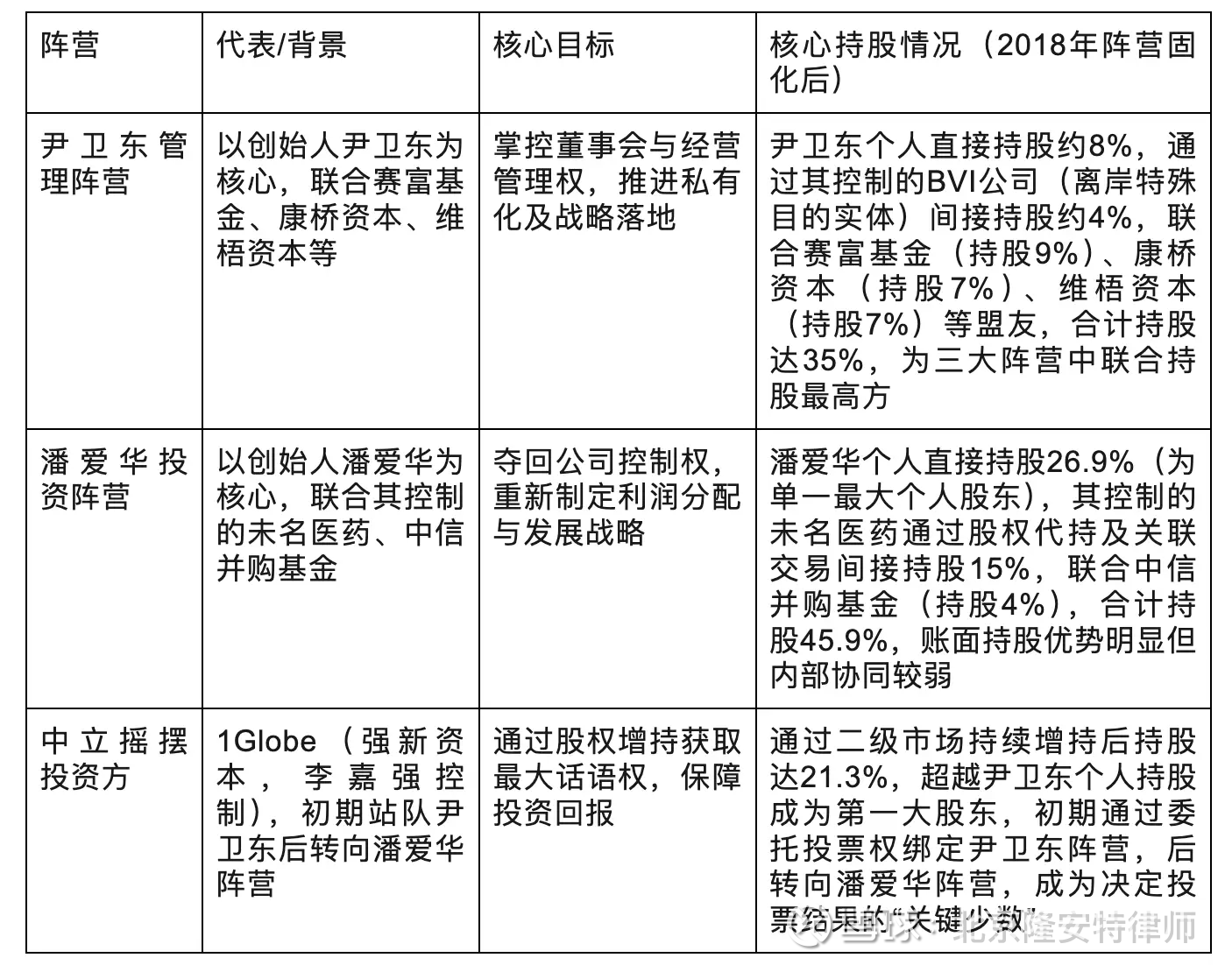 这一举措引发投资派强烈不满,2018年,潘爱华联合1Globe在科兴生物注册地安提瓜提起诉讼,核心诉求直指“投票权实质不平等”——认为权利协议非法剥夺了其按持股比例享有的投票权,违反安提瓜《公司法》“同股同权”的基本原则。从各方投票权实质行使情况来看,科兴生物遵循“同股同权”基础规则,但通过协议设计形成差异化权利:尹卫东阵营通过一致行动人协议掌控35%的集中投票权,且可通过“毒丸计划”稀释对手投票权;潘爱华阵营虽合计持股45.9%,但未名医药与中信并购基金存在利益分歧,实际可统一行使的投票权仅30%左右;1Globe的21.3%投票权则成为“摇摆票”,其立场转换直接决定决策结果,这也是其后期能主导诉讼走向的核心原因。