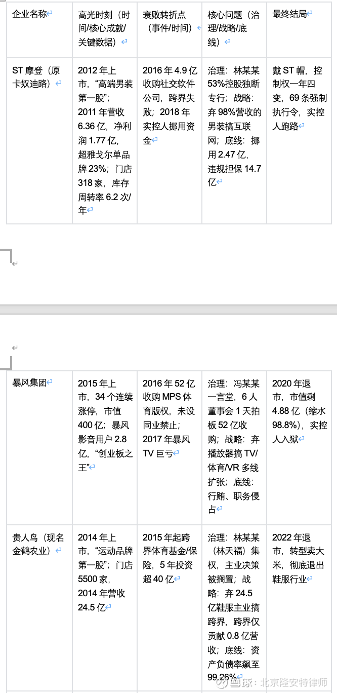 如果把ST摩登的故事看作“孤例”,或许会归咎于“创始人私心”;但当暴风集团、贵人鸟等企业的经历摆在一起,就会发现“从巅峰到谷底”的剧本早已写好。先通过一张表格,看清这些企业“兴与衰”的关键节点: