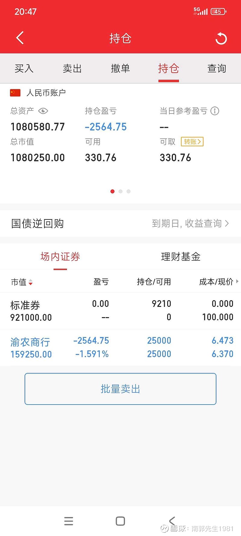 2025.9.15保守投资第179个交易日买在高点今日操作:6.47买入渝农商行25000股休息了很久,还是打算买点,科技不敢追,感觉大盘要调整了,应该银行要表现一下,上午银行有一波拉升,刚好买在高点。上午看K线图,觉得银行要反弹,但收盘来看K线图,又是破位走势。银行股行情是不是已经结束了?我再看两天决定是否割肉。