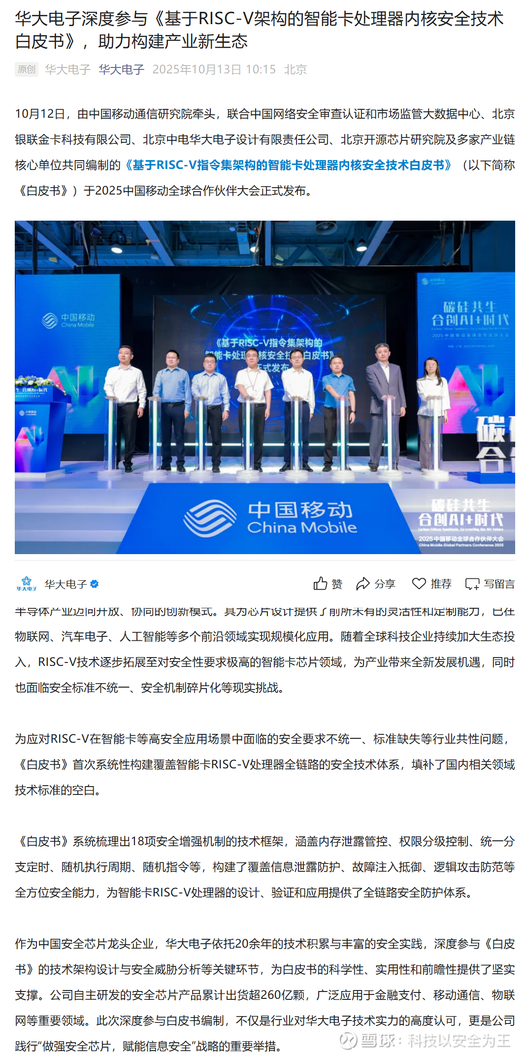 在日前举办的2025中国移动全球生态伙伴大会上,中国电子信息产业集团在香港的上市公司中电华大科技(HK: 00085)的全资子公司北京中电华大电子设计有限责任公司与中国移动和和中国银联等机构共同发布了《基于RISC-V指令集架构的智能卡处理器内核安全技术白皮书》。华大电子也是中电华大科技的主要营收和利润来源。此次发布有几个方面值得关注: