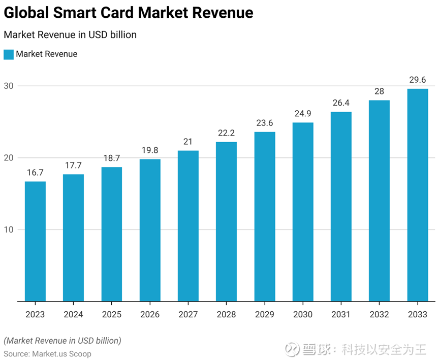 最近看到市场研究机构Market.us的一份报告:《2025年智能卡统计报告:安全、技术、控制维度划分(Smart Card Statistics 2025 By Security, Technology, Control)》,作者:Tajammul Pangarkar。该报告预计到 2033 年,全球智能卡市场收入将达到 296 亿美元。如果按照智能卡行业芯片成本占整卡成本平均可达50%,甚至金融卡超过80%来算,全球智能卡芯片市场很快就是一个超千亿元的大市场,国内紫光和华大电子两家头部智能卡芯片设计企业都只有20多亿元的营收,发展空间还很大,因此全资持有国内领先智能卡芯片企业华大电子的中电华大科技(HK: 00085)还是有巨大发展空间的,何况该公司的市值还不到30亿元。