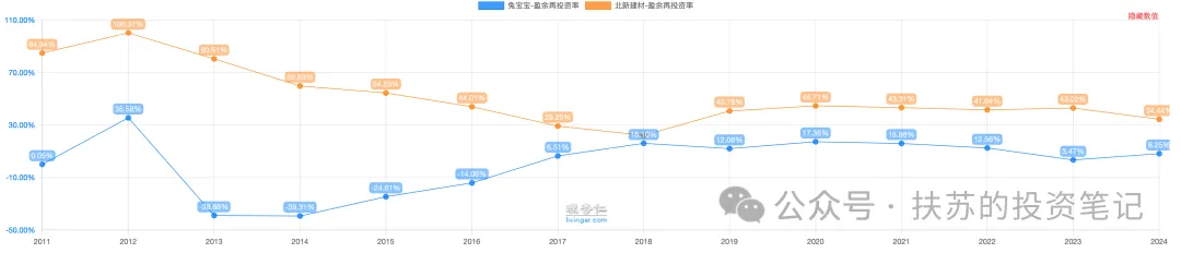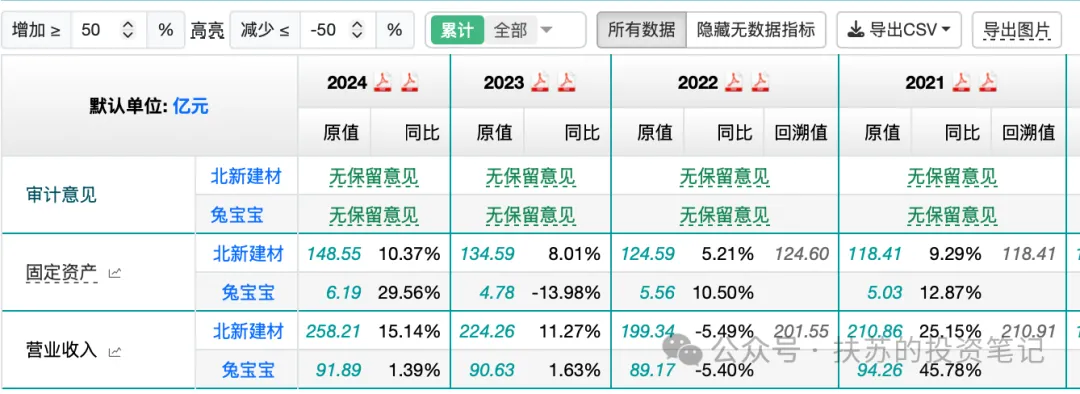 兔宝宝 2024 年用 6 个亿的固定资产就可以撬动 90 亿的营收,而北新建材 150 亿的固定资产撬动 260 亿的营业收入。