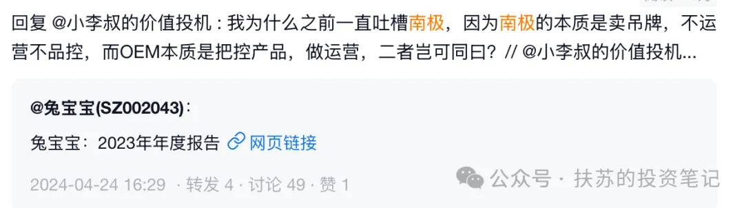 兔宝宝采用“品牌+渠道”为主的轻资产策略,超90%的板材产品通过OEM代工模式生产,无需投入巨资建设生产线,仅通过输出研发技术、品控制度整合优质代工厂资源,少量固定资产即可通过高效渠道与品牌力放大营收。这方面的反例代表就是某南极。
