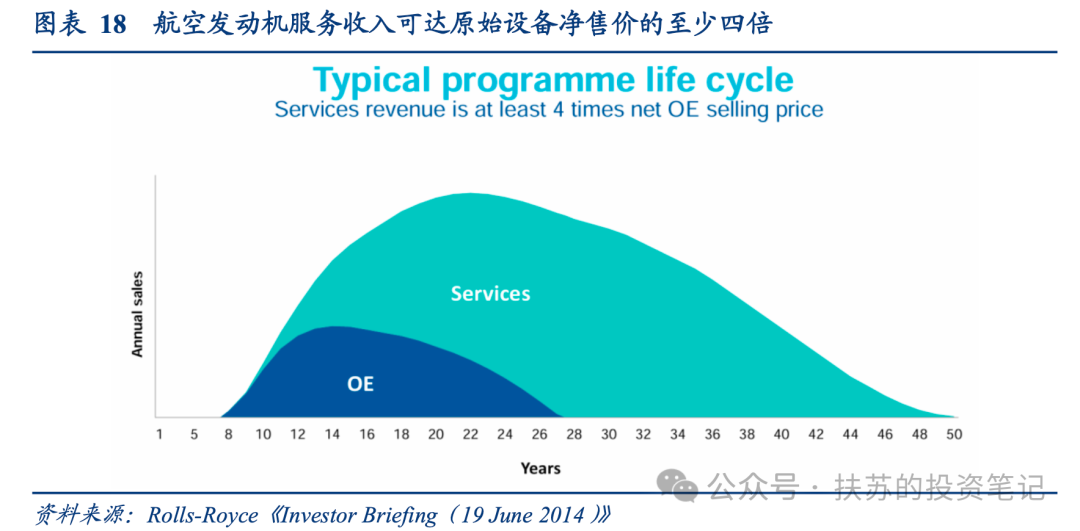 对于发动机来说,OEM制造商的维修份额占比高达60%,这不难理解,谁也不敢冒风险。航空公司按小时付费,检修,更换配件,供应商通过服务锁定长期收入。