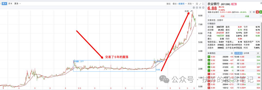 银行股的破净,折价,给投资者带来了巨大的折扣买入优势。比如下图的农业银行,盘整了5年,在不断的积累净资产后,随着不可描述的原因,快速上涨了130%