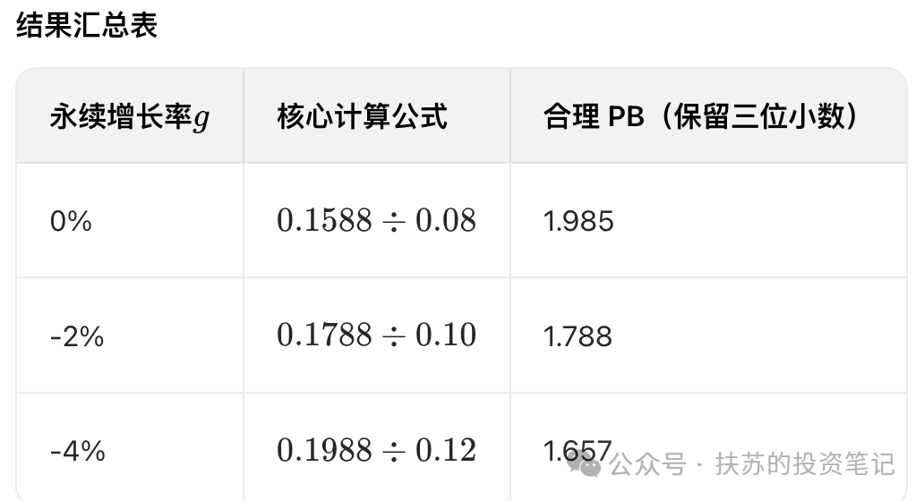 在ROE、折现率固定的熊市背景下,永续增长率g持续下行(从 0% 到 - 4%),合理 PB 逐步降低,符合此前的变量影响逻辑:g越低,公司长期增长预期越悲观,市场愿意为 1 元净资产支付的价格越少。