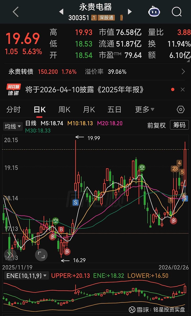 $永贵电器(SZ300351)$ 哪位高手知道,这种走势该走还是该留?看元宝给出的结论好像要我卖出了:面临关键压力:今日高点19.25元接近前期震荡区间上沿,上方19.5-20元区域是强压力位,若无量能配合,难以有效突破。2. 量能不足:今日上午成交额约1.64亿元7,放量不够显著,冲高基础不牢固。