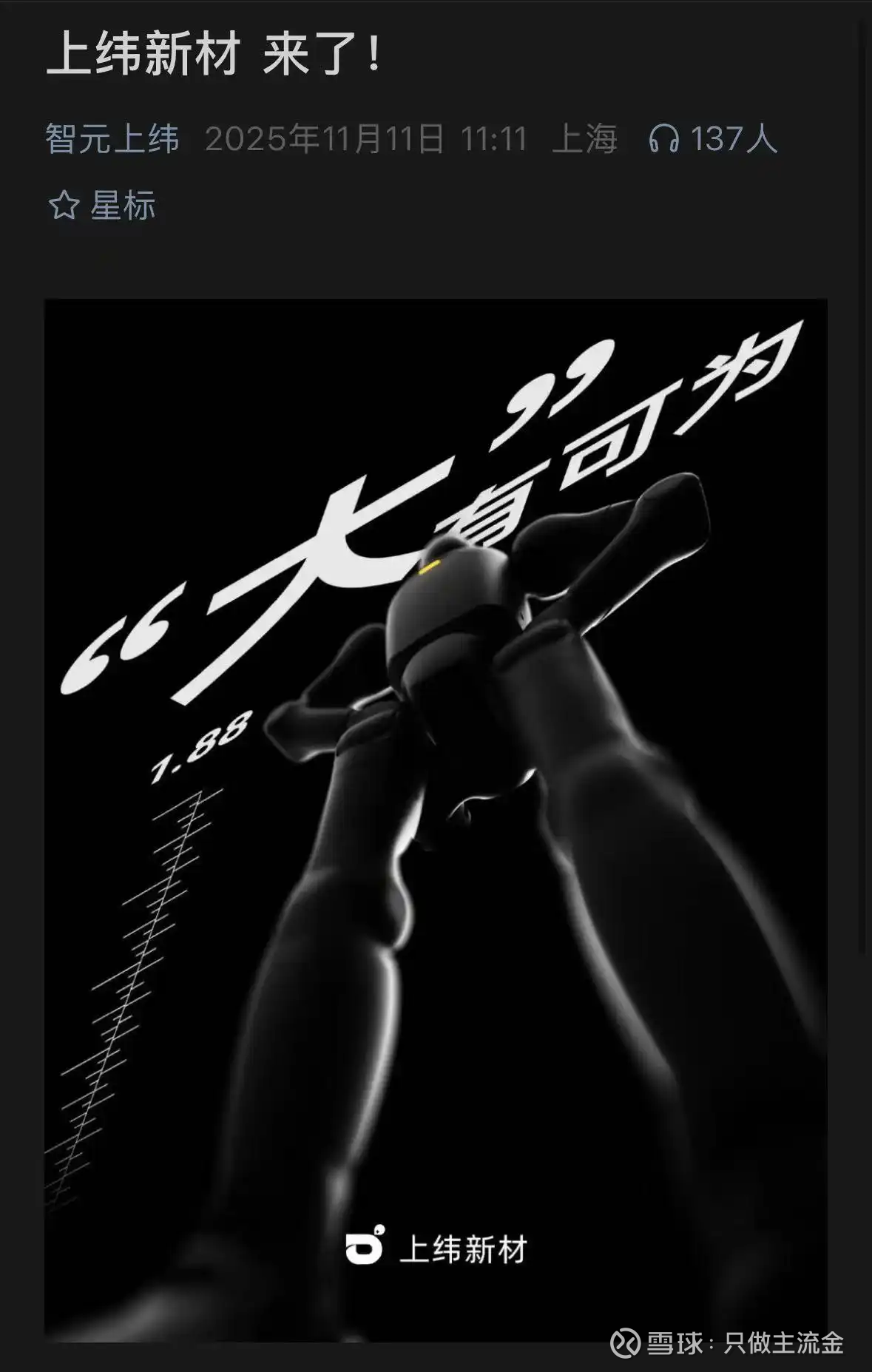 11月11日,上纬新材通过旗下公众号“智元上纬”发布人形机器人产品预告海报,其中一张明确标注“身高1.88米”,暗示将推出全尺寸人形机器人产品。上纬新材股价当日午后直线拉升涨停,收盘价130.20元/股,市值达525亿元。