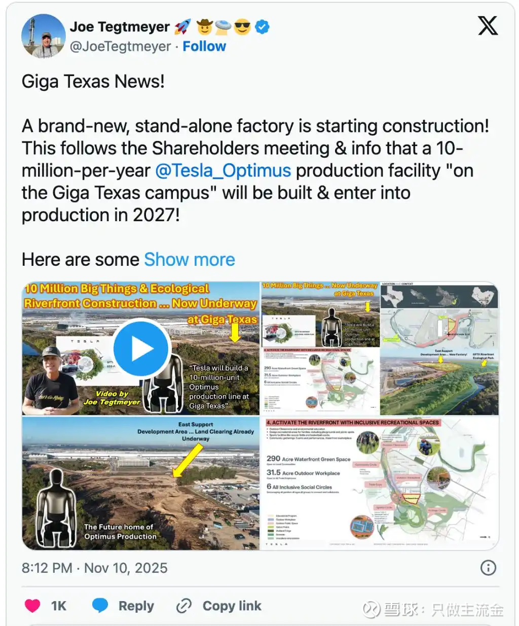 11月11日,据特斯拉垂直媒体Teslarati报道,特斯拉计划对其得克萨斯州超级工厂进行新一轮扩建,拟新建专用于Optimus人形机器人的生产基地。该生产基地规划年产能达1000万台,预计于2027年投产。