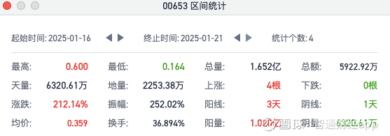 众所周知,自1月16日,卓悦控股股价出现异动暴涨,4个交易日(16日至21日)以来涨幅超过2倍,达到212.14%。根据智通财经APP观察,4个交易日内,该公司区间成交量为1.652亿股,成交总额为5922.92万港元。