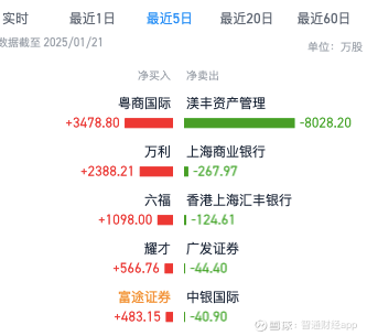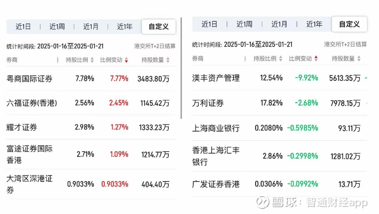 从1月16日至21日经纪商变动来看,增持前五的经纪商分别为粤商国际证券、六福证券(香港)、耀才证券、富途证券国际香港及大湾区深港证券,增持比例分别为7.77%、2.45%、1.27%、1.09%及0.9033%;减持前五的经纪商分别为渼丰资产管理、万利证券、上海商业银行、香港上海汇丰银行、广发证券香港,持股比例变动分别为-9.92%、-2.68%、-0.5985%、-0.2890%及-0.0992%。