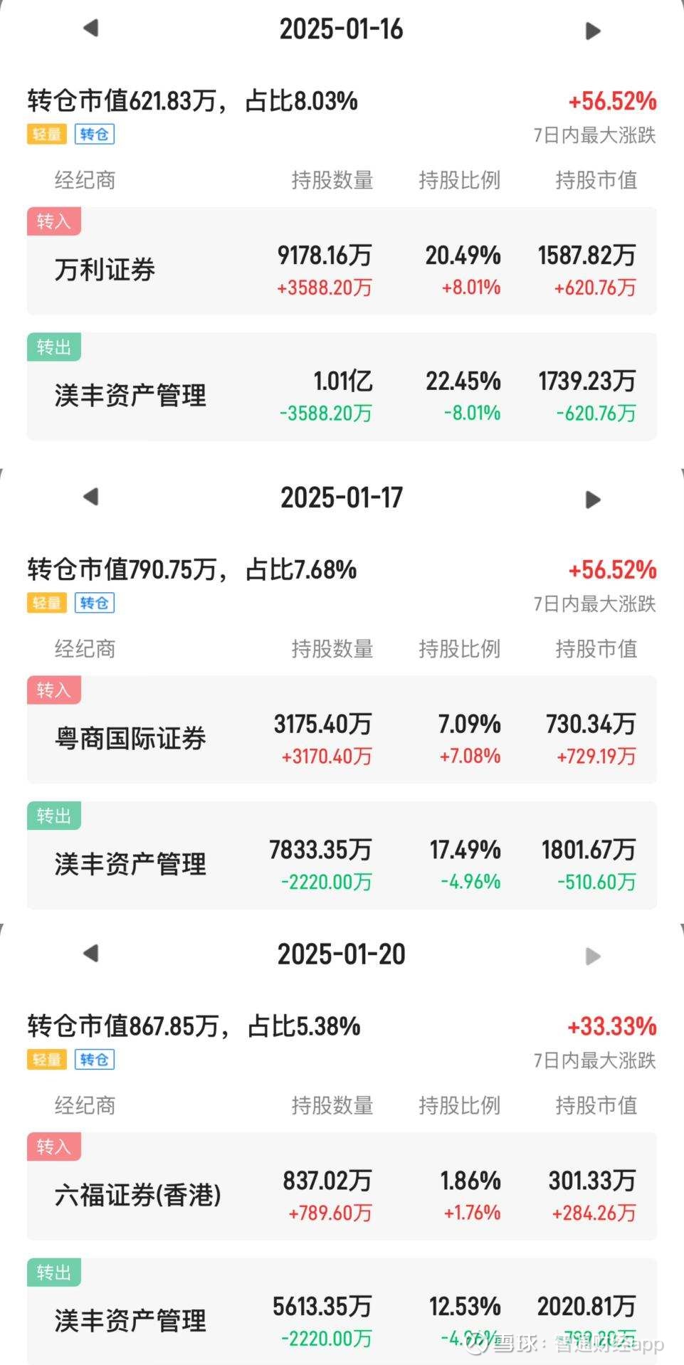 具体来看,1月16日,渼丰资产管理转出3588.20万股至万利证券,转仓市值约为621.83万港元,占比8.03%;1月17日,渼丰资产管理转出2220.00万股,持股比例下降4.96%至17.49%,转入方为粤商国际证券,其持股数量增加3170.40万股,持股比例增加7.08%;此次转仓市值为790.75万港元,占比7.68%;1月20日,渼丰资产管理转出2220.00万股,持股下降4.96%至12.53%,转入方为六福证券(香港),其持股数量增加789.60万股,持股比例增加1.76%至1.86%,此次转仓市值为867.85万港元,占比约为5.38%。
