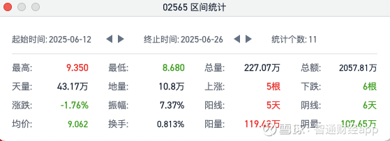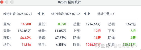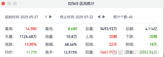 其三,从 K 线形态来看,多空力量均衡。上涨与下跌天数均为 20 天,阳线 22 天对阴线 18 天,看似平衡的背后隐藏着 13.85% 的净涨幅,这种 "平衡中的不平衡" 是典型的主力控盘特征,主力通过反复震荡清洗浮筹,避免形成单边趋势。