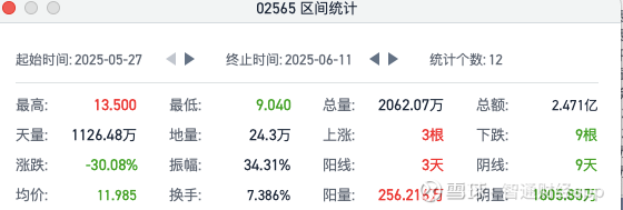 首先,大跌时期是 5 月 27 日至 6 月 11 日,股价从 13.5 高点下跌至最低点 9.04 港元。这一阶段,该股首日即破发,收盘跌 25.9%,成交量约 1126 万股,换手率为 4.04%,这表明大量中签投资者在首日抛售,导致股价承压,筹码快速分散。随后几个交易日,仍不改暴力砸盘风格,该股一路下跌,阴量 1805.85 万远超阳量 256.216 万(比例达 7:1),但换手率仅 7.386%,显示资金对倒打压明显,诱导散户交出筹码。