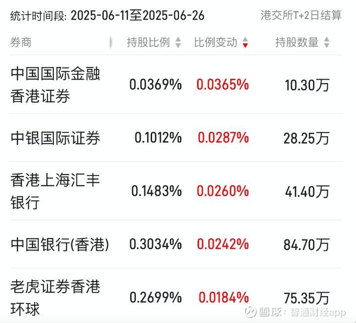 这一阶段,买入席位前五位分别为中国国际金融香港证券、中银国际证券、香港上海汇丰银行、中国银行(香港)及老虎证券香港环球,持股比例分别增加 0.0365%、0.0287%、0.0260%、0.0242% 及 0.0184%