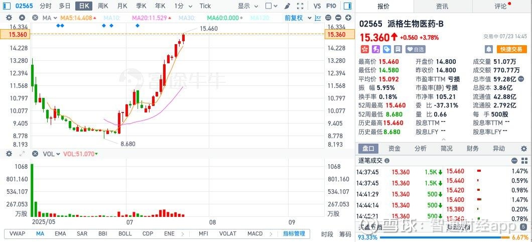 自 6 月 27 日至 7 月 22 日,该股一改上市以来下跌,反而一路上扬,涨幅近 66%。截至 7 月 23 日收盘,该公司收报 15.44 港元,几乎接近发行价 15.6 港元,总市值约为 59.59 亿港元。