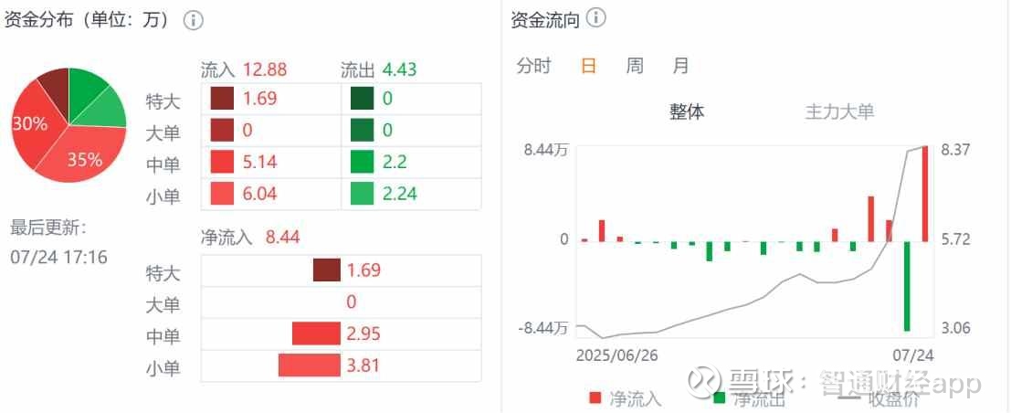 从当日资金流向来看,7月23日,在股价大涨的同时,燃石的短期筹码实现了充分换手,当日资金净流出7.82万美元。而在大涨次日,中小单成为燃石的入场主力。通常来说。中小单成交往往代表着散户投资者的交易行为。虽然单笔量小,但它们的频繁涌入展现了市场的活跃程度。7月24日,燃石医学交易资金中,资金净流入8.44万美元,中小单合计净买入6.76万美元。