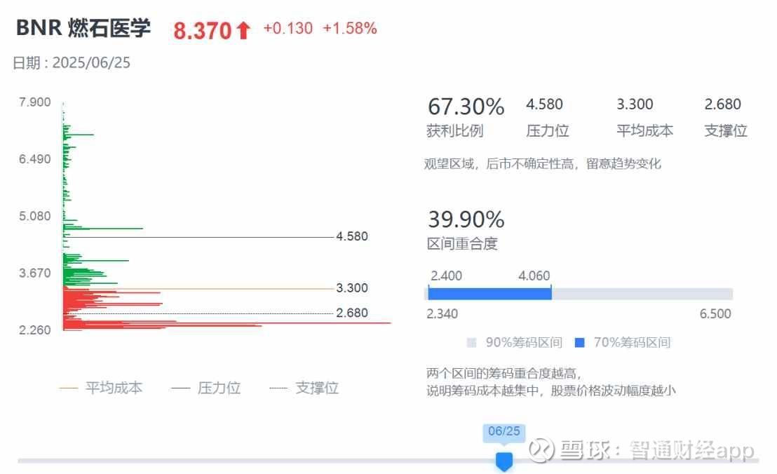 燃石医学也由此在6月开启了一段横盘震荡期。今年6月,公司股价涨幅仅为1.94%,几乎维持了一个超稳定的横盘效果。而买方资金在此过程中能够用部分筹码打压做盘,同时又承接抛压筹码,使其大部分筹码仍锁定在吸筹区域,并且期间,燃石医学的日均股票成交量明显变小,除了6月12日前后有明显的股价拉升及成交量变化外,其余时间单日成交量鲜有超过5万股,说明市场抛单少,大量筹码在低位堆积。