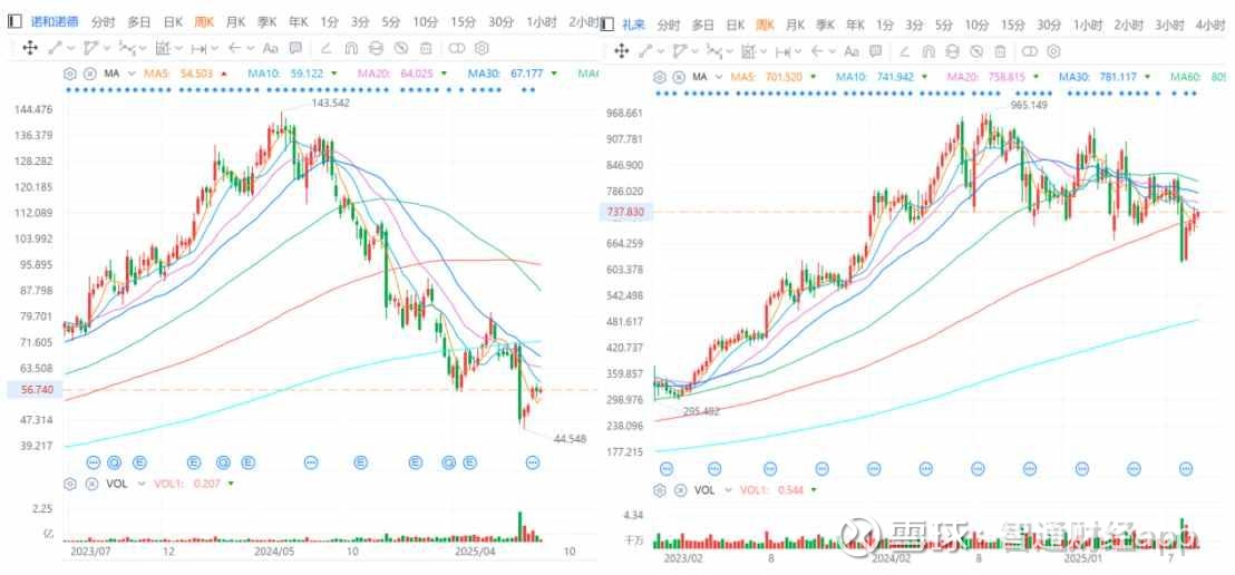 (周线走势图,左:诺和诺德,1809.94亿美元;右:礼来,6966.29亿美元)