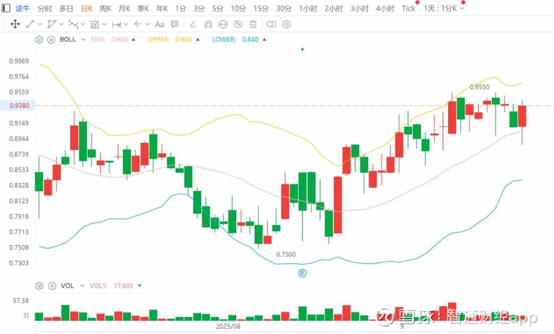 2天后,途牛便公布了其25Q2财报,而这也是其股价在BOLL线中轨徘徊的第三个交易日,财报表现无疑将决定其后续走势方向。
