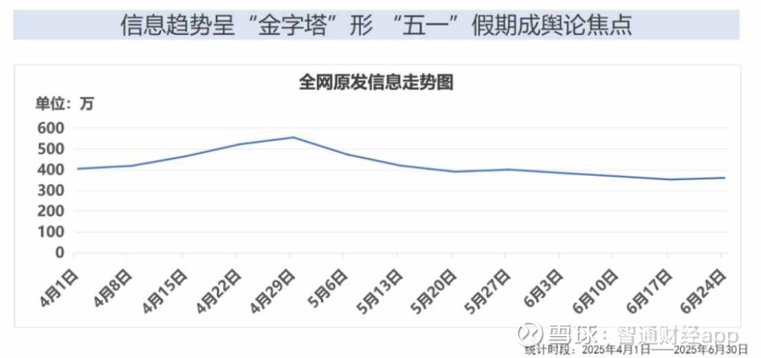并且从全网原发信息走势图可以看出,2025年第二季度旅游信息走势呈“金字塔”形,舆论高峰出现在4月29日至5月5日之间。也就是说,“五一”假期出游成为Q2季度舆论焦点,侧面体现了公众对节假日,尤其是小长假旅游的热情和活跃度。另一方面,数据显示“五一”期间跨市住宿订单占比已突破八成,国内长线游预订出游人次占比达46%。