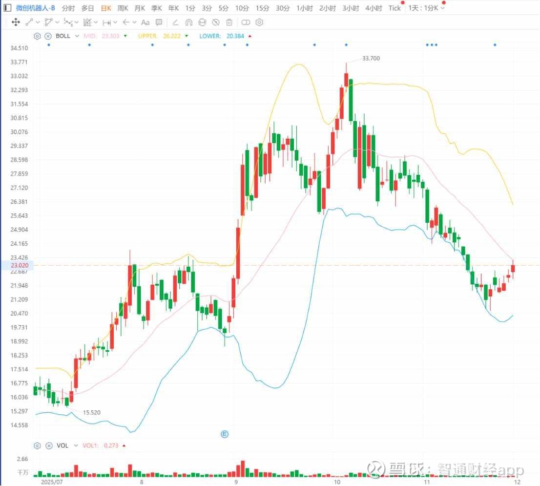 随着10月8日微创机器人股价再次站上BOLL线上轨并拉出一根长上影线,后续回调信号已然触发。10月9日,微创机器人股价收跌7.54%,开启了为期超过30个交易日的下行区间。