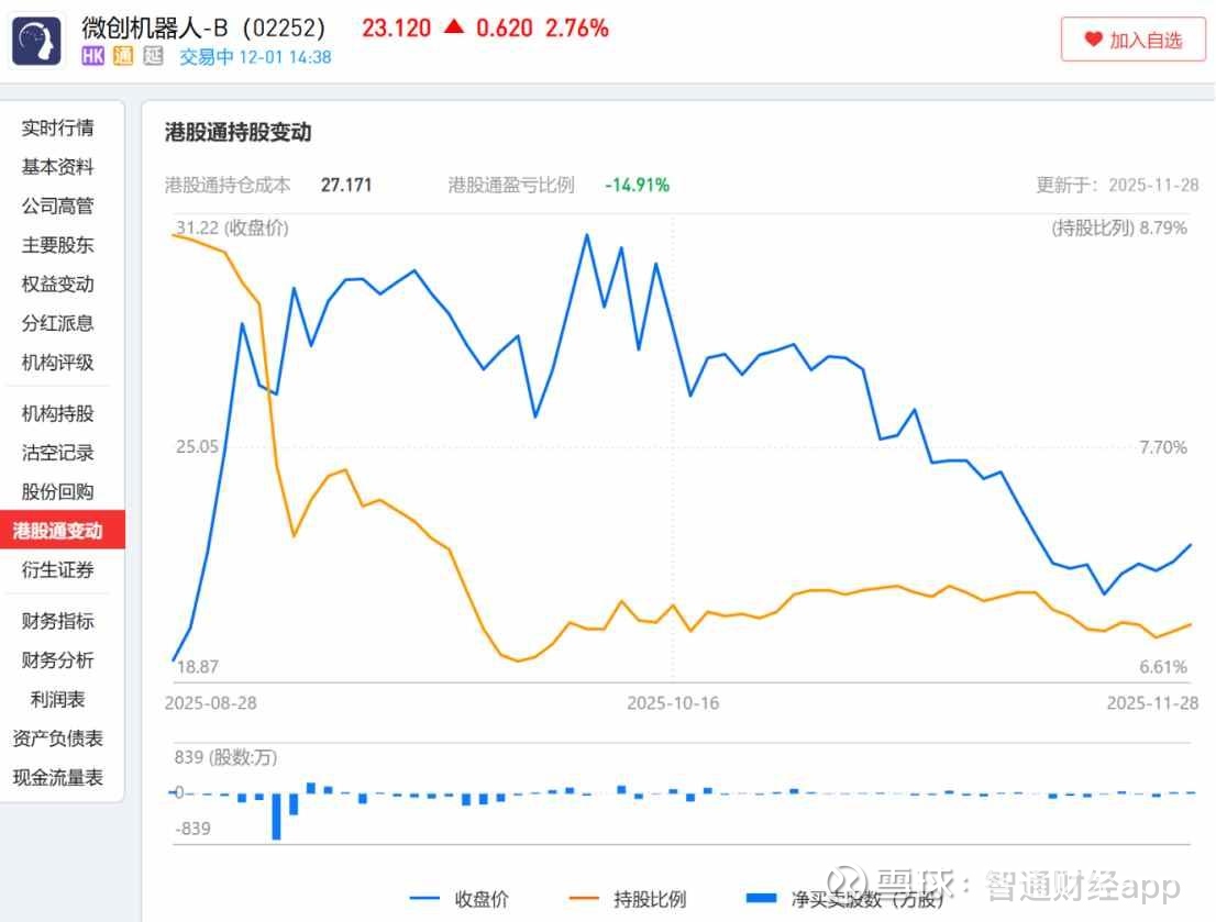 然而,在10月9日微创机器人开启下行行情后,港股通资金却未积极买入,整体持股比例一直维持在6-8%之间,以致持仓成本一直处于27港元以上的高位。截至11月末,港股通对微创机器人的持仓亏损达到14.91%。