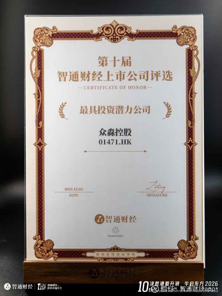 2025年12月3日,众淼控股(01471)$众淼控股(01471)$ 在备受瞩目的“第十届智通财经资本市场年会暨上市公司颁奖典礼”上,成功斩获“最具投资潜力公司”大奖。