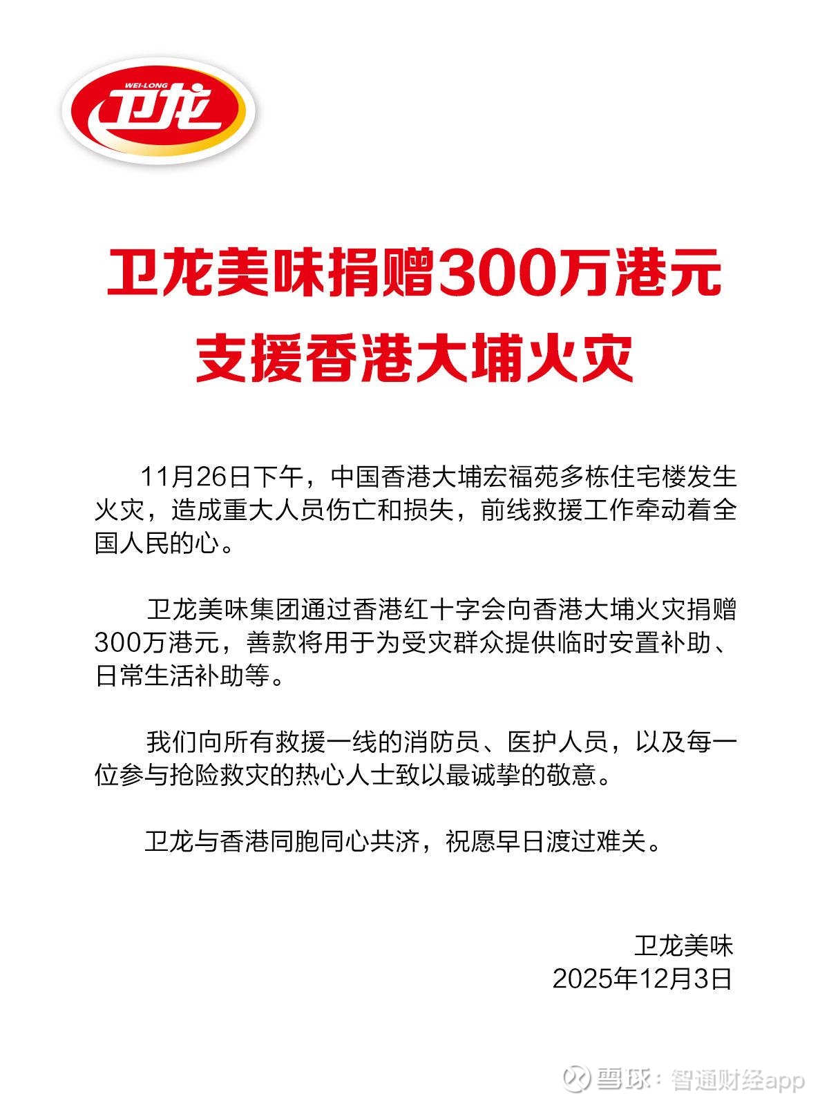 智通财经APP获悉,12月3日,卫龙美味(09985)$卫龙美味(09985)$ 在社交媒体发布公告,宣布通过香港红十字会向香港大埔火灾捐赠300万港元,用于支援受灾群众的救助工作。