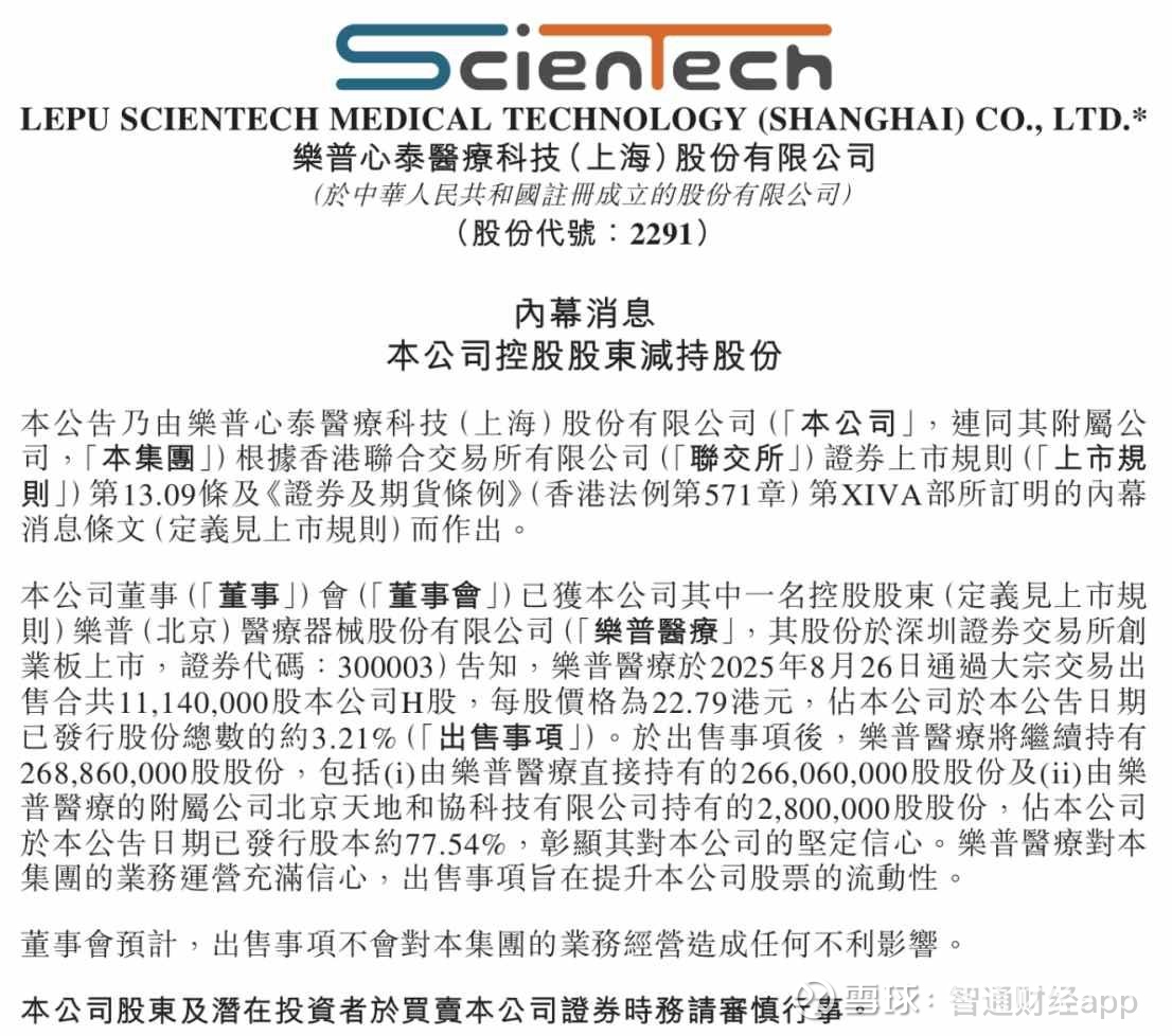 8月26日港股盘前,心泰医疗发布了一则“控股股东减持”的公告,称其控股股东乐普医疗“于2025年8月26日通过大宗交易出售合共1114万股本公司H股,每股价格为22.79港元,占本公司于本公告日期已发行股份总数的约3.21%(出售事项)”,并表示,“乐普医疗对本集团的业务运营充满信心,出售事项旨在提升本公司股票的流动性。”