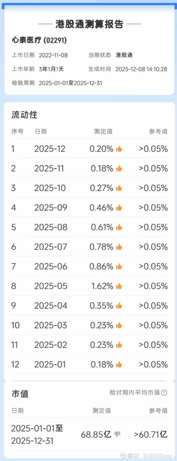 据智通财经APP数据显示,恒生指数和港股通下一轮定期调整时间在明年3月,检讨结果公布时间在2月25日,检讨周期则为2025年1月1日至2025年12月31日。目前心泰医疗该检讨周期内日平均市值为68.85亿港元,仅较目前60.71亿港元市值门槛高出8.14亿港元。考虑到现已时至12月上旬,距离港股通最新一轮调整考察期结束仅有约20多天时间,因此心泰医疗只要市值不出现突发的剧烈波动,便可以在新一期调整中维持港股通地位。但若不能在后续实现股价和市值反弹,心泰医疗的“出通”风险或许会一直对其造成困扰。