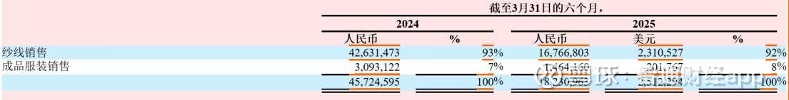 据招股书内的财务数据,报告期内,公司营收分别为 8256.37 万元 (人民币,单位下同) 及 8762.24 万元,同比增长 6.2%。细分来看,公司的业务主要分为纱线销售和成品服装销售。其中,纱线销售为公司最主要的营收来源,公司超九成营收来自于此,2024 财年来自纱线销售的营收占比高达 95%。